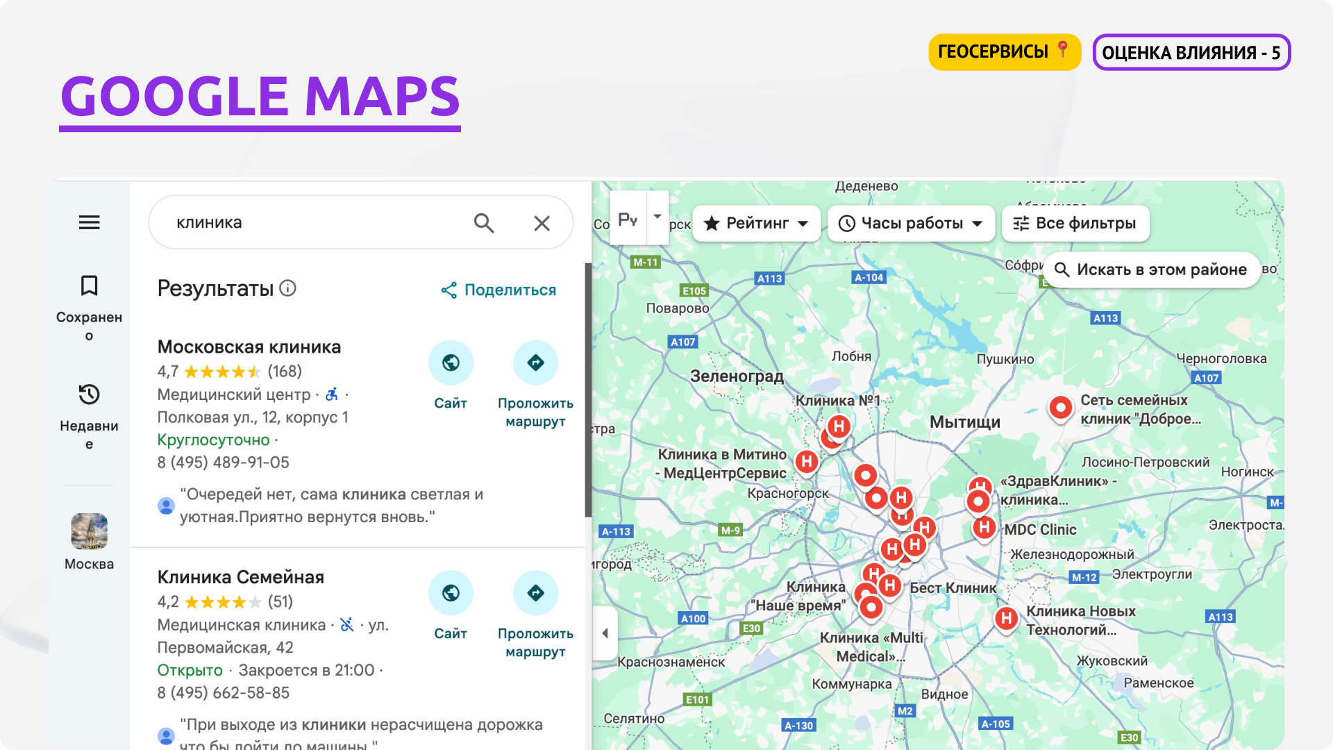 Ключевой геосервис для медицинской ниши в России. Именно здесь пациенты чаще всего впервые проверяют рейтинг клиники, читают отзывы и принимают решение о записи.