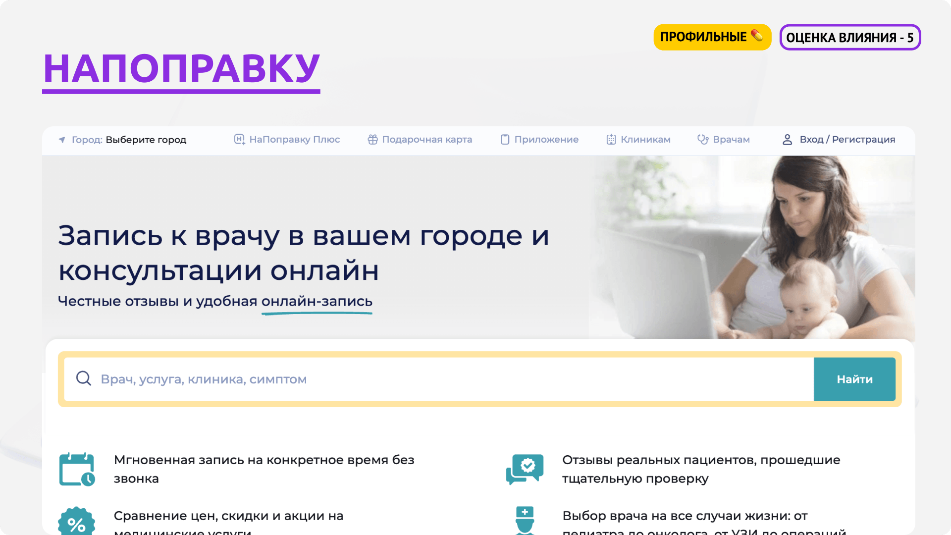 NaPopravku.ru — медицинский сервис с аудиторией более 5 млн пользователей в месяц. Это не только поиск врачей и клиник по отзывам, но и возможность пройти онлайн-консультацию с врачом прямо на платформе. Здесь активно развита категория психологической помощи, что делает сервис особенно полезным для клиник, работающих в смежных направлениях.