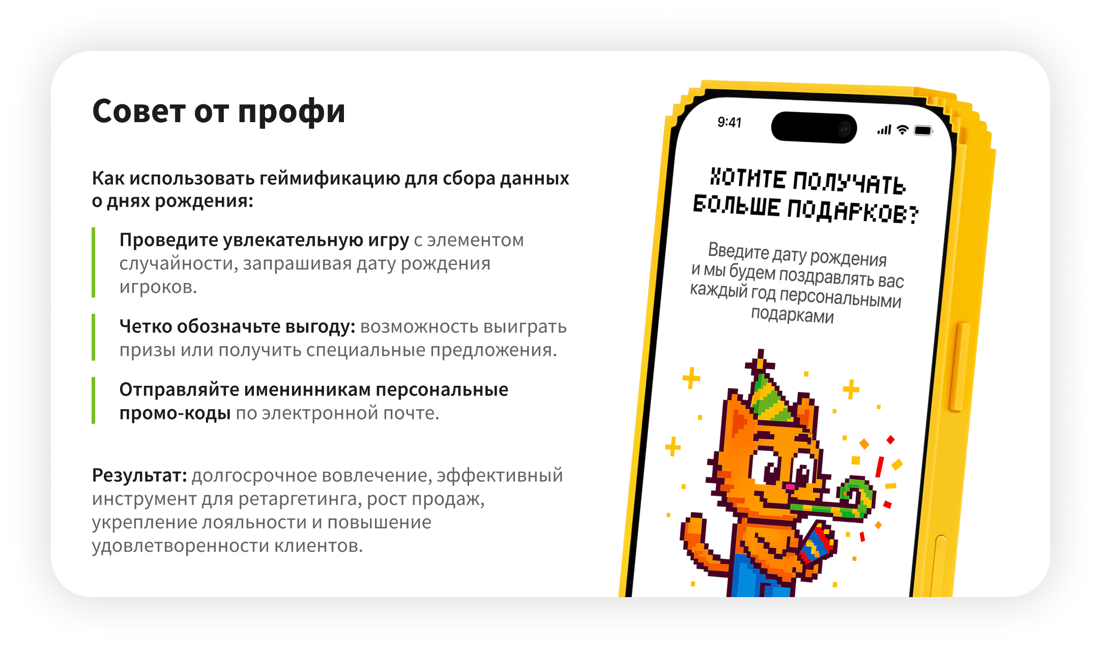 Например, игровой тест на определение типа личности или потребительского профиля помогает в легком формате собрать ключевую информацию о предпочтениях, привычках и важных датах. Полученные инсайты становятся основой для выстраивания индивидуальной коммуникации, специальных предложений и сервиса, который не просто нравится, а вызывает лояльность и эмоциональную связь с брендом.
