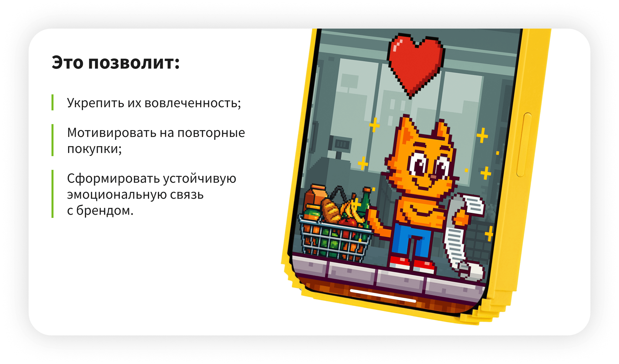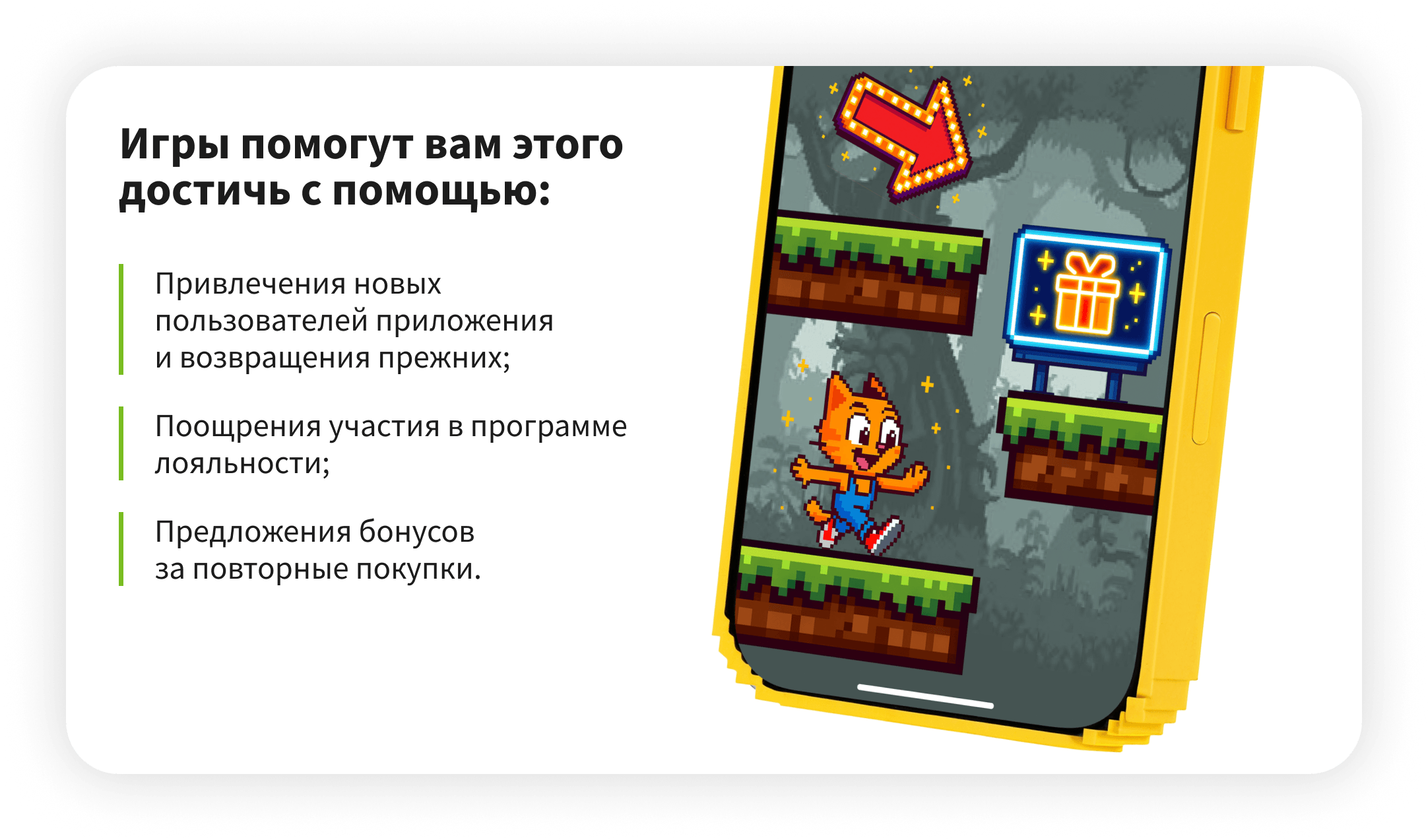 Эффективный способ добиться этого — внедрение игровых механик. Они помогают привлекать аудиторию в приложение, вовлекать в программу лояльности и поощрять повторные покупки. Ожидание нового вознаграждения и удовольствие от процесса превращают обычные покупки в увлекательную привычку, побуждая покупателей выбирать вас вновь.