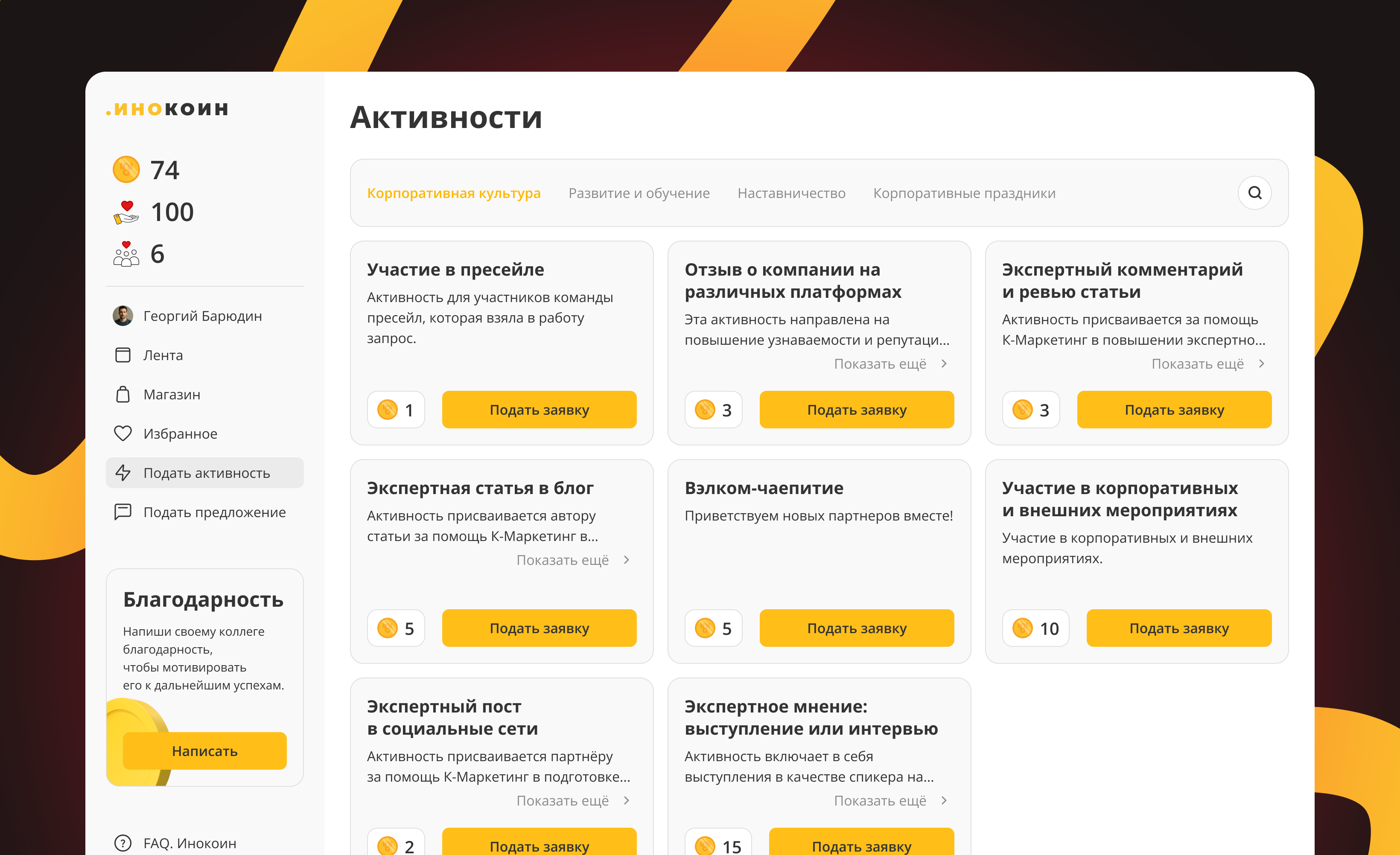 Мы встроили Инокоин в повседневную работу, чтобы фиксировать результаты, которые раньше оставались незамеченными. Сотрудники знают, за что получают инокоины и благодарности. Платформа учитывает любые действия: задачи, обучение, помощь коллегам, инициативы.
