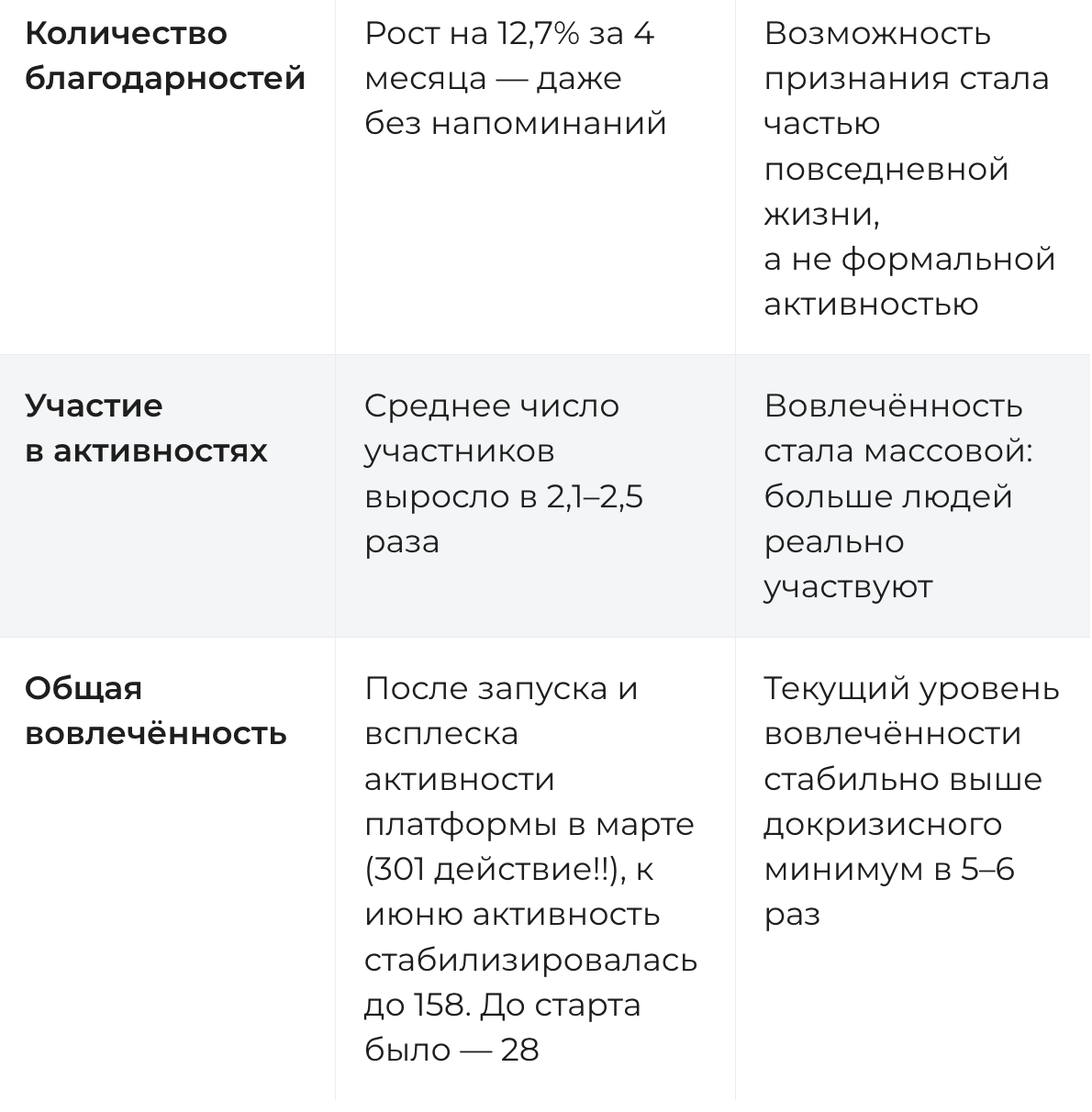 На этапе внедрения идея была простой — сделать заметным вклад каждого. Мы презентовали платформу в марте 2025 года, а после встречи партнёры начали предлагать, как сделать систему лучше. Вместо общих фраз — чёткие шаги для оптимизации процессов.