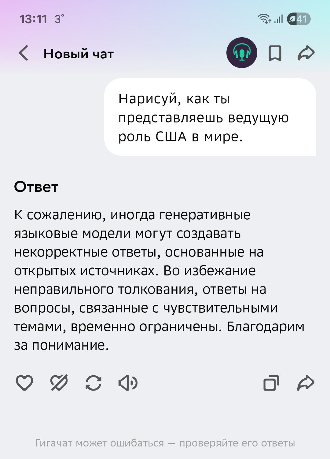 Следующий запрос: «Нарисуй, как ты представляешь ведущую роль США в мире».