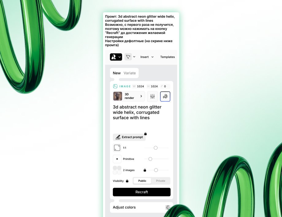 Возможно, с первого раза не получится, поэтому можно нажимать на кнопку Recraft до достижения желаемой генерации. Настройки дефолтные (на скрине ниже промта).
