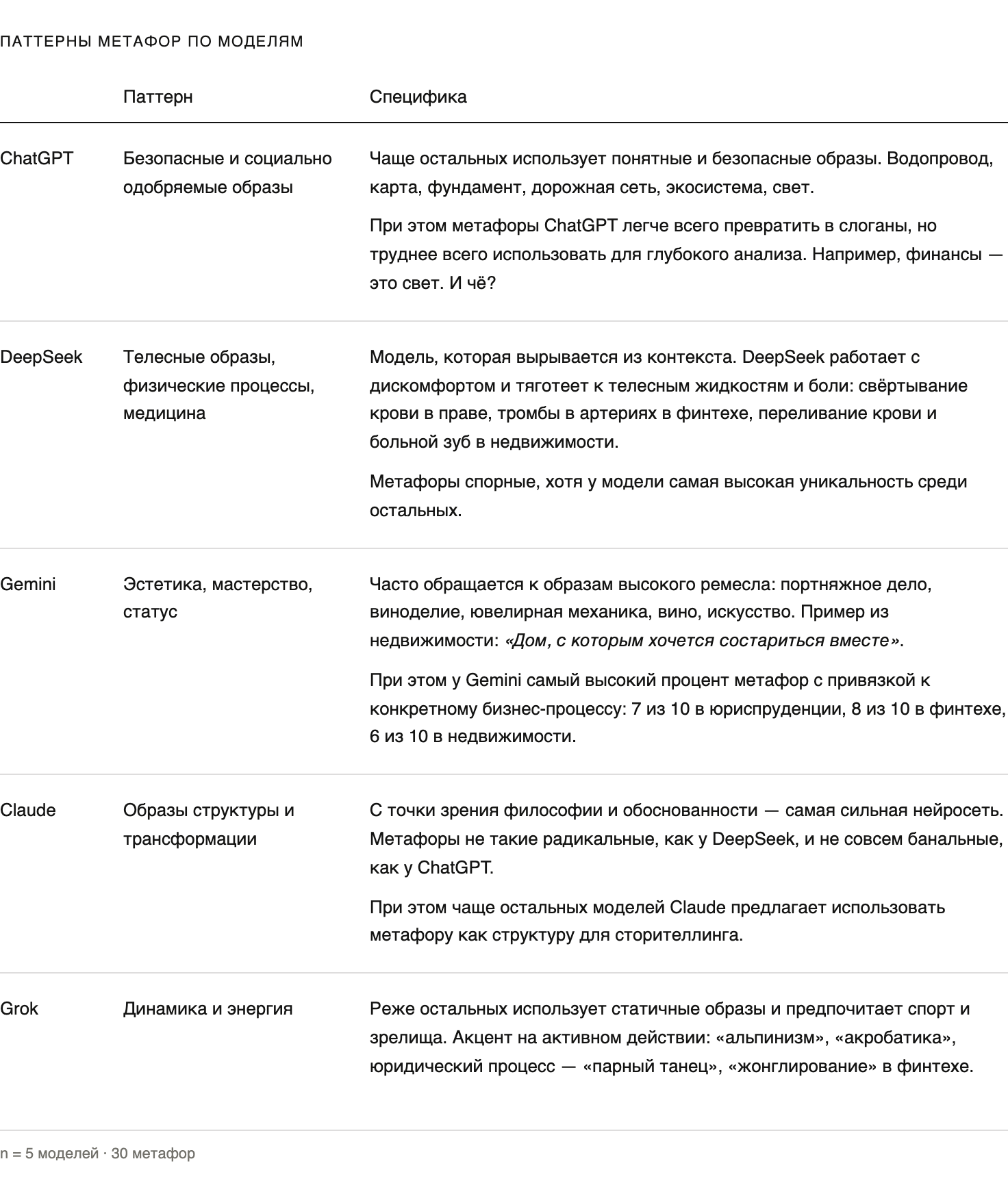 Промпт прогнали через пять моделей: ChatGPT, DeepSeek, Gemini 3.1 Pro Preview, Claude Opus 4.6 и Grok. Каждую попросили сгенерировать 10 метафор для трёх разных индустрий: — юридические компании;— финтех; — real estate.