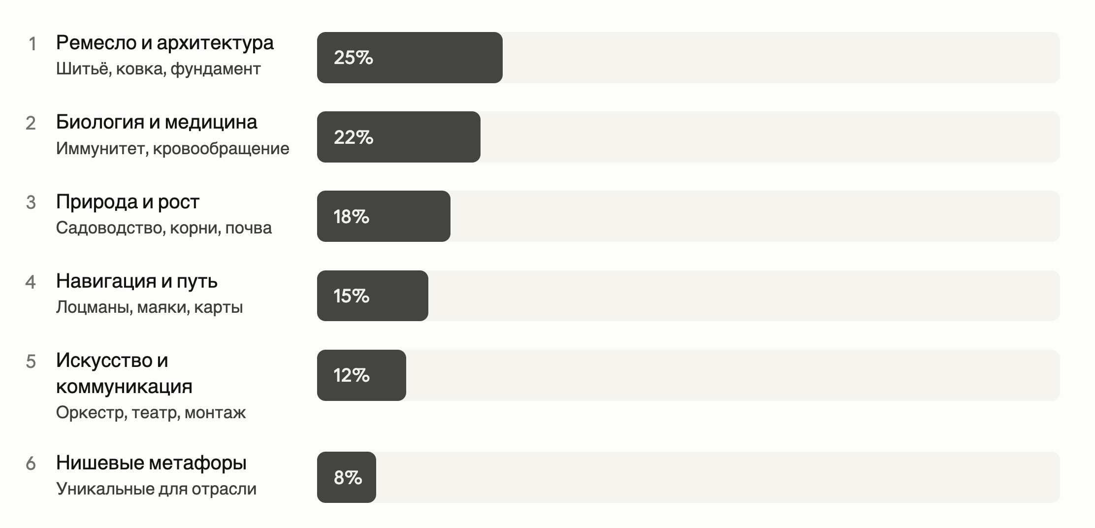 Неважно, какую индустрию подставляешь в промпт — модели тянут метафоры из пяти областей: навигация, тело, ремесло, архитектура и ботаника. Это 43% всех метафор. Остальные 57% — из других 20 областей по 1–2 метафоре.