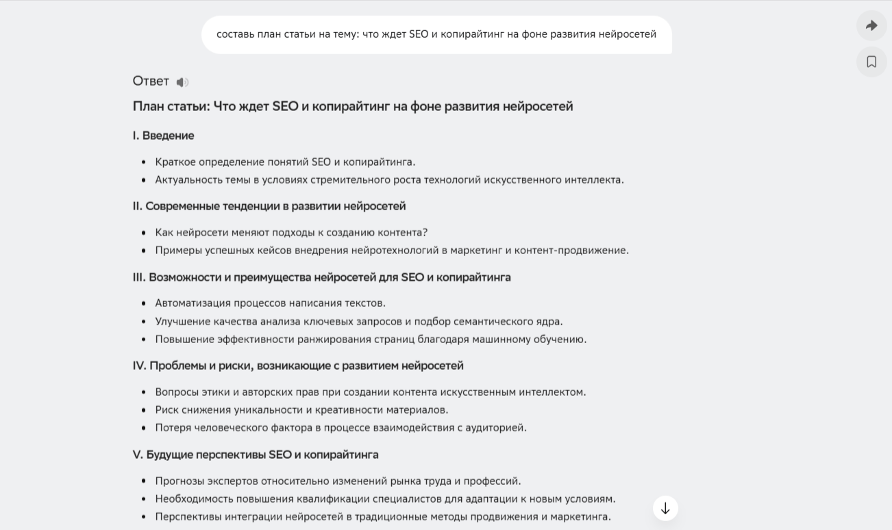 Сейчас видно, что авторы посредственного контента становятся менее востребованными. Даже SEO-специалист, вооруженный платной языковой моделью, способен написать простой текст, который удовлетворяет базовым требованиям поисковых систем.