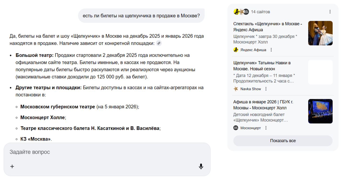 Поисковые системы интегрируют генеративный ИИ так, чтобы пользователь получал цельный ответ на свой вопрос. Например, если вы в Google спросите про лучшие рестораны Москвы, ИИ сначала покажет краткий обзор, рекомендации и рейтинги прямо в блоке ответа. Аналогично в «Яндексе» новая версия поиска с нейросетью отвечает на вопросы и формирует структурированный текст сразу в выдаче.