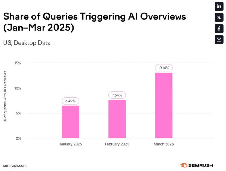 На самом деле количество запросов в Google, покрытых ИИ-ответами, стремительно растет. По данным Semrush.com, в январе 2025 их было 6.49% от всего числа запросов, а в марте 2025 — уже 13.14%. Это приводит к каннибализации трафика поиском: процент zero-кликов тоже быстро увеличивается.