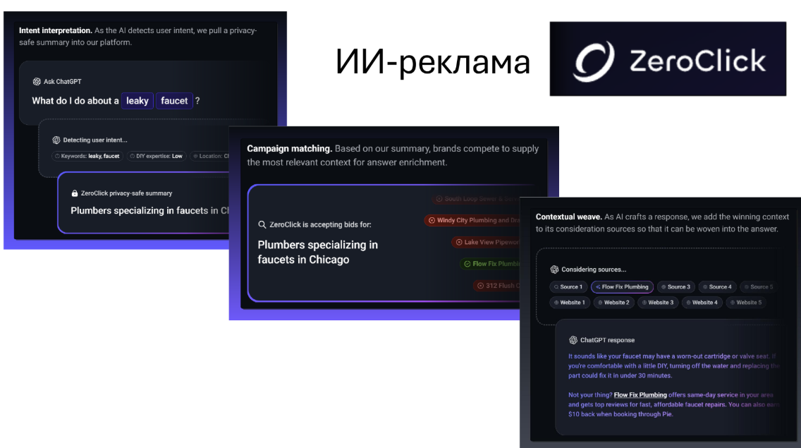 Более показательный пример — новая рекламная сеть из США ZeroClick. Она предназначена для монетизации ботов. В отличие от ChatGPT, сеть не показывает карточки товаров, а влияет на текст, который генерирует бот.