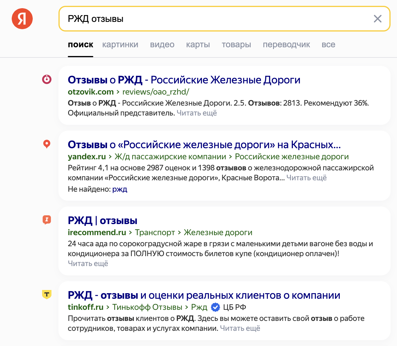 Начать можно с поиска брендового упоминания. Здесь стоит обратить внимание на геосервисы и сайты с отзывами, например, 2ГИС, Zoon, Отзовик. Вероятно, они будут не на первой странице, так как корпоративные сайты и новостные порталы обычно высоко ранжируются по брендовому запросу. Уже на этом этапе можно найти полезные платформы и интересные формулировки, которые предлагают колдунщики Яндекса или Google.