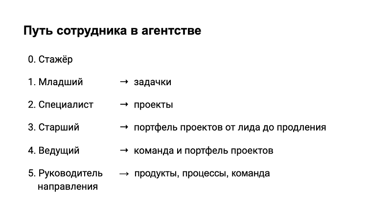 Чем выше уровень человека, тем меньше ему нужен ведущий и тем больше напарник в развитии. В агентстве сложилось сообщество сильных профессионалов, которое в этом помогает.