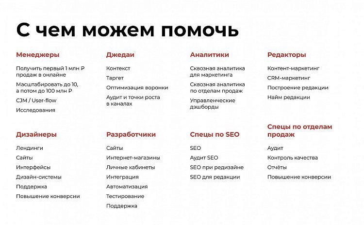 Сотрудники в направлениях объединены по специальностям. Направления работают как над клиентскими проектами, так и над внутренними проектами агентства. Например, редакторы выстраивают контент-маркетинг не только внешним заказчикам, но и реализуют контент-стратегию IT-Agency. А менеджеры, кроме работы над клиентскими задачами, готовят обучающий курс по специальности Product Marketing Manager.