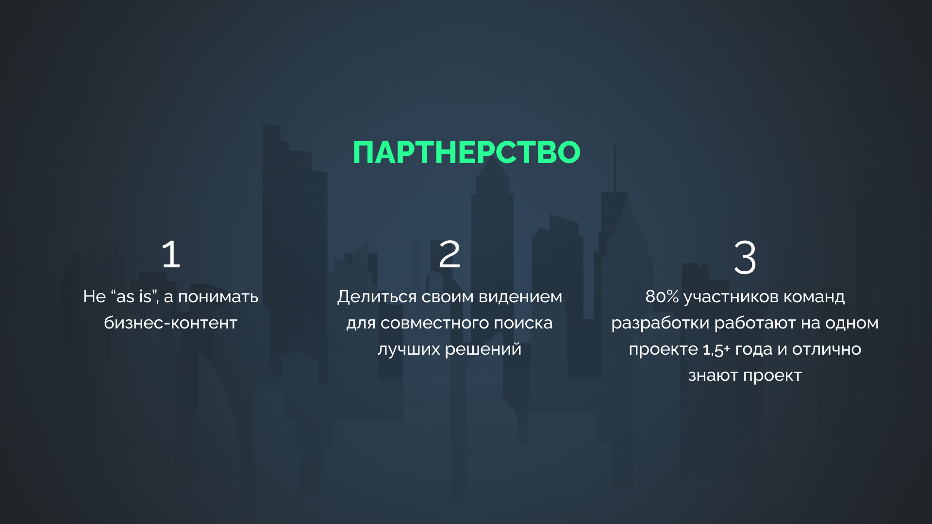 Второй принцип — партнерство. В отличие от традиционной модели «заказчик-исполнитель», партнерство предполагает более глубокое сотрудничество, основанное на взаимной ответственности и вовлеченности.