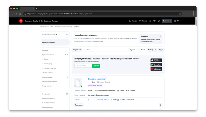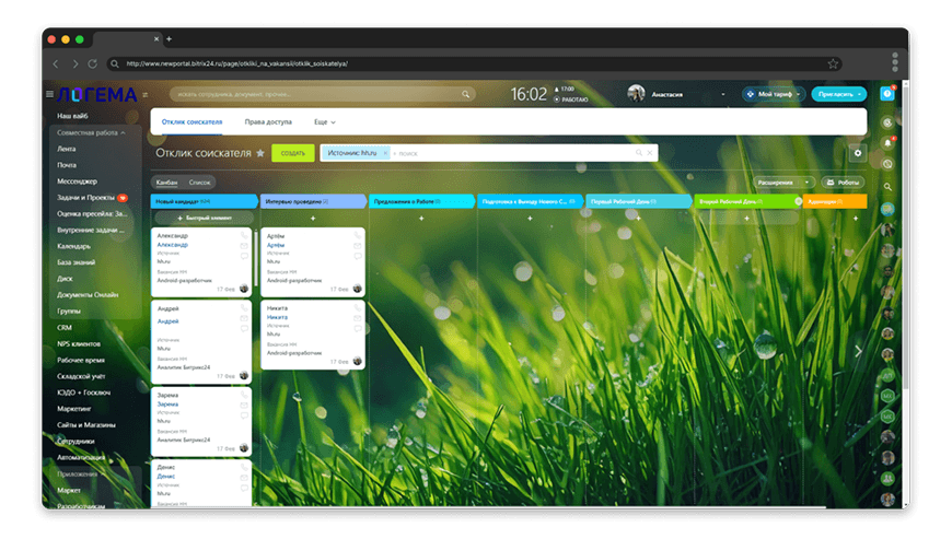 1. Автоматизация процесса найма и повышение его эффективности. Пока HR проводит собеседование с кандидатом, в воронке «Отклик соискателя» копятся новые резюме.