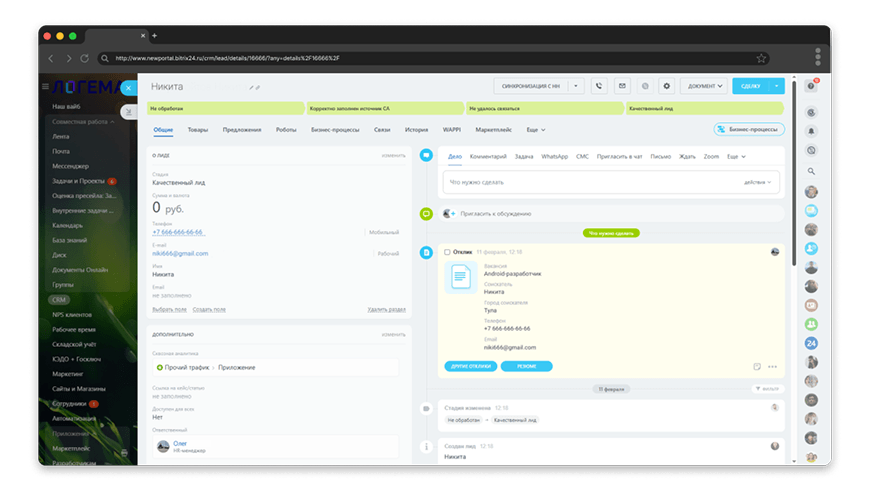 ❛❛ Для компаний, которые активно используют HeadHunter для поиска новых сотрудников, интеграция с Битрикс24 упрощает и автоматизирует процесс найма. HR работает с удобной воронкой, в которой отражен полный цикл – от первого касания с резюме кандидата, до адаптации в компании. Если в будущем потребуется, воронку можно масштабировать, например, добавить новые этапы отбора кандидатов или докрутить систему уведомлений, например, если в процесс найма должен подключаться еще один сотрудник. Кроме того, инструменты CRM помогают собрать нужные данные кандидата, а система уведомлений (роботы) – автоматически подключает других ответственных коллег и напоминает HR о предстоящих задачах. Всё оптимизировано и автоматизировано. Битрикс24 можно назвать идеальным рабочим местом для HR, которое настраивает на эффективный найм. ❜❜