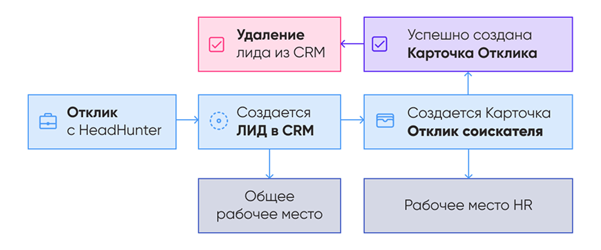 В случае с HR нужно было систематизировать поток входящих откликов с hh.ru, чтобы узнавать о новых кандидатах в Битрикс24. Когда за рабочую неделю прилетает пара десятков откликов – это не кажется проблемой. Но в инсайдерской информации от нашего HR фигурирует цифра до 100 откликов в неделю. И это только верхушка айсберга.