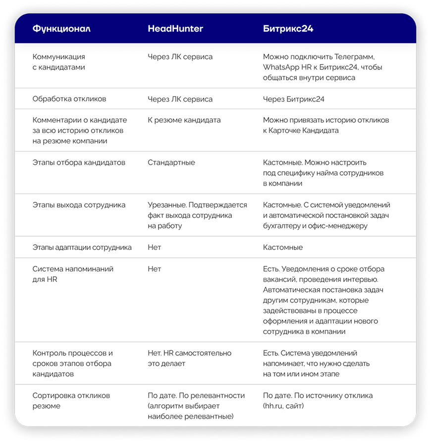 Функционал HeadHunter стандартный (но не гибкий!), подходит для отбора кандидатов – до этапа найма и адаптации сотрудника. Там нет системы уведомлений – эту информацию надо держать в голове, в Excel, в календаре или в каком-то другом сервисе.В Битрикс24 настроены необходимые этапы воронки для HR, а роботы помогут не забыть завершить каждый этап в срок.