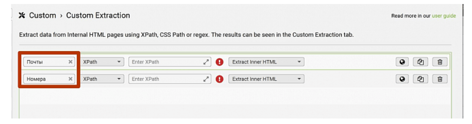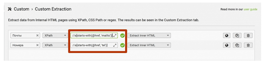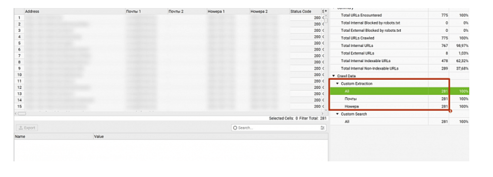6. После окончания парсинга переходим в раздел Custom Extraction, в котором вы увидите все почты и номера, которые фигурируют на страницах вашего сайта.