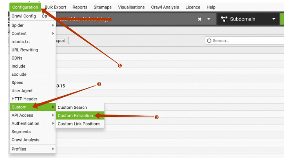 1. Запускаем Screaming Frog. Переходим в раздел “Configuration” – “Custom” – “Custom Extraction”.