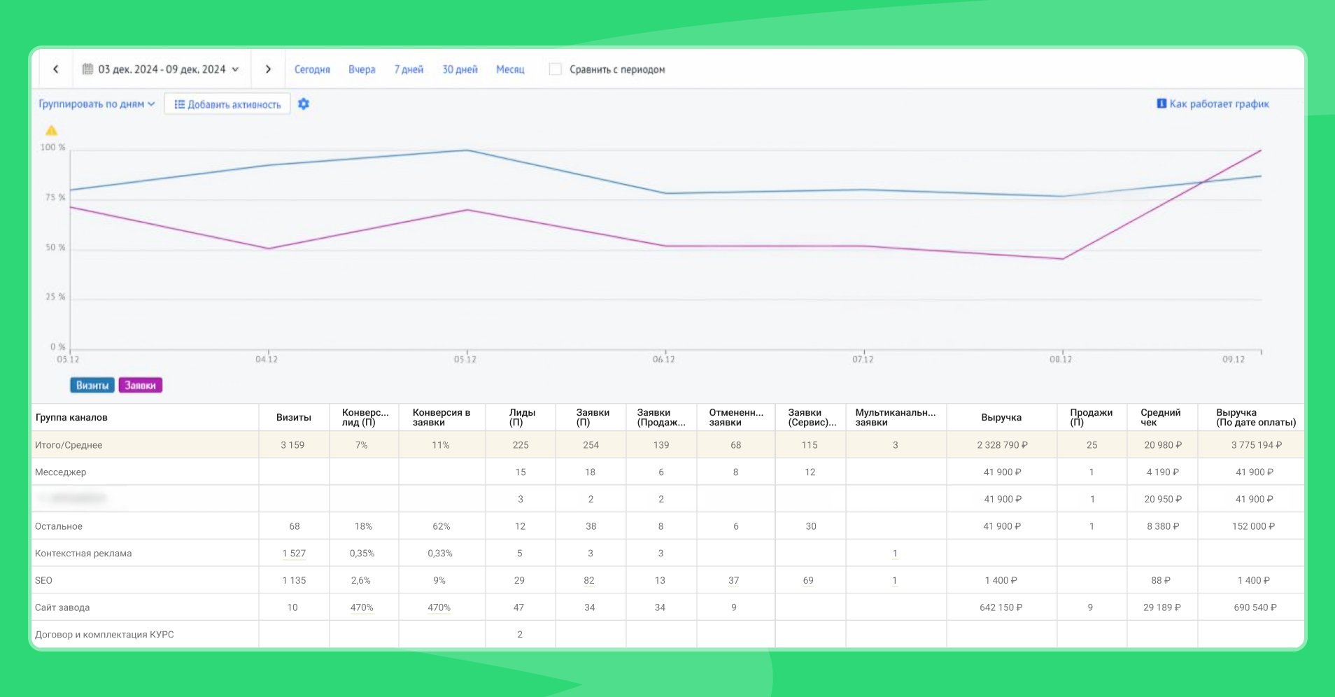 А компания Виллабаджо настроила аналитику и знает, какая сумма была вложена в рекламу и сколько это принесло выручки, а также они знают, что в следующем месяце могут получить ещё больше, если отдел продаж будет связываться с клиентом быстрее. Ещё они понимают, какая часть клиентов возвращается к ним снова, а какая так и не доходит до сделки. Эти и другие данные аналитики помогут компании Виллабаджо улучшать свою маркетинговую стратегию и расти. Их аналитика выглядит иначе, совершенно прозрачно: мы видим конкретное количество лидов из каждого канала, знаем, сколько из них было продаж и сколько это в эквиваленте выручки.