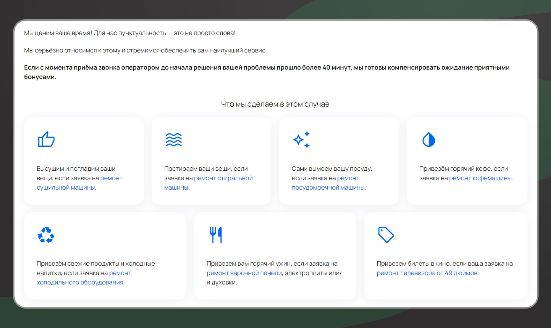 Если мастер приступает к работе позже заявленного срока, то компания компенсирует ожидание приятными бонусами: горячим кофе, обедом или даже стиркой вещей. Такие офферы были взяты в том числе за основу рекламных объявлений. Заказчику со своей стороны остается выполнять заявленное обещание, и это уже тема следующего пункта.