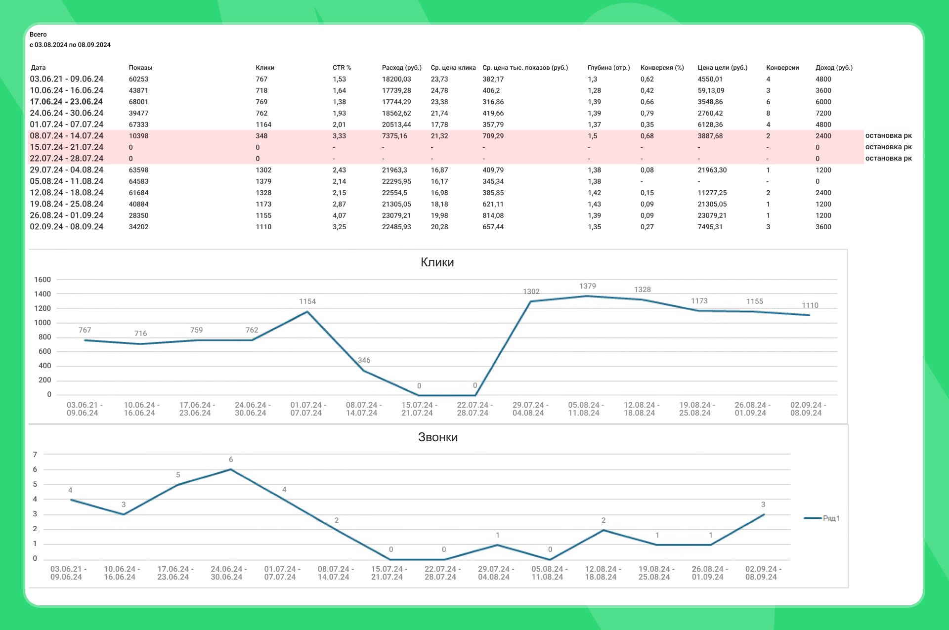 Качественный рост невозможен без качественной аналитики. Без неё невозможно знать точно, через какие каналы приходят клиенты и почему. Сервисы сквозной аналитики и коллтрекинга позволяют изучить путь клиента от рекламных объявлений вплоть до повторной продажи. Также это достоверный способ понять, какой маркетинговый инструмент окупает себя и приводит заявки, а какой впустую сливает бюджет. Рекомендуем не пренебрегать аналитикой и подключить её на старте работ. Именно аналитика позволяет находить эффективные точки роста.