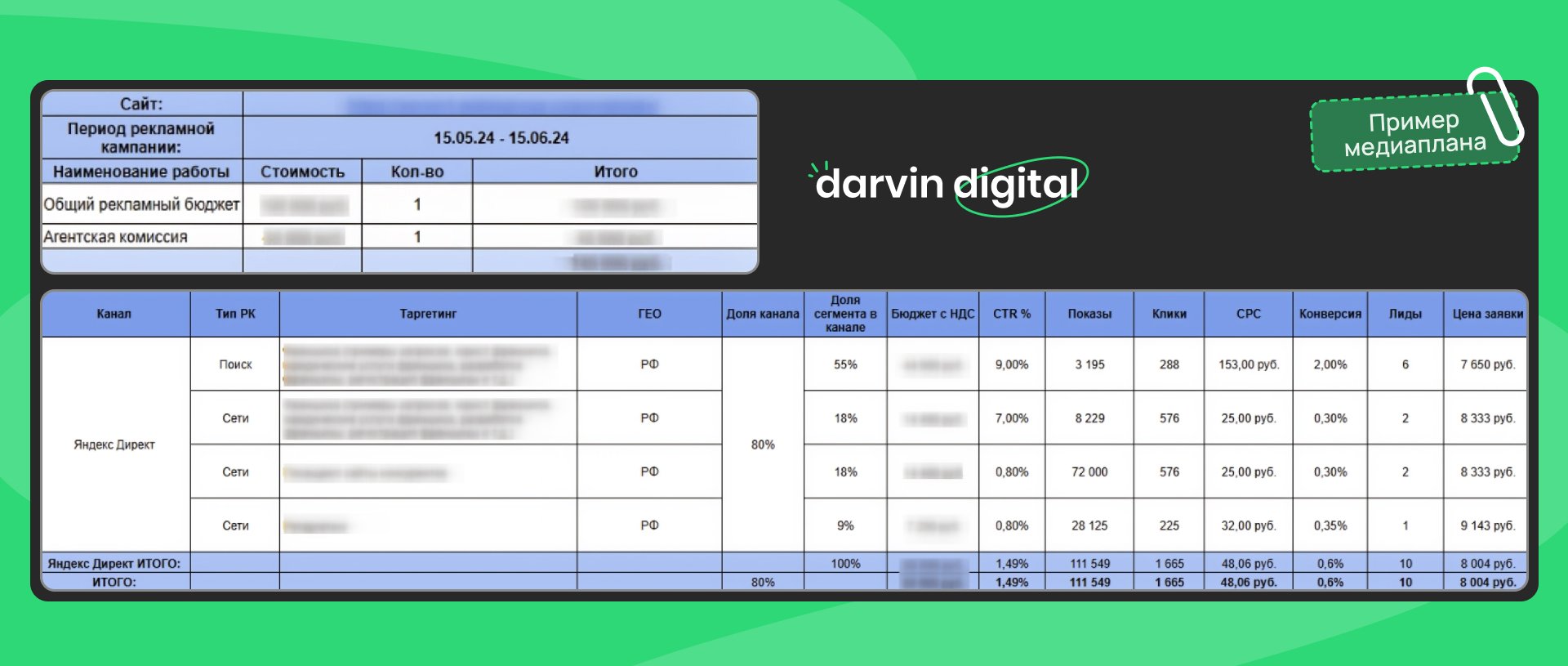 Например, в рекламе Яндекса есть порог вхождения по бюджету для эффективности рекламы. Он позволяет поддерживать определённый поток конверсий в неделю для полноценной работы кампаний. Вот так выглядит расчёт окупаемости на нашем сайте и пример медиаплана Darvin Digital: