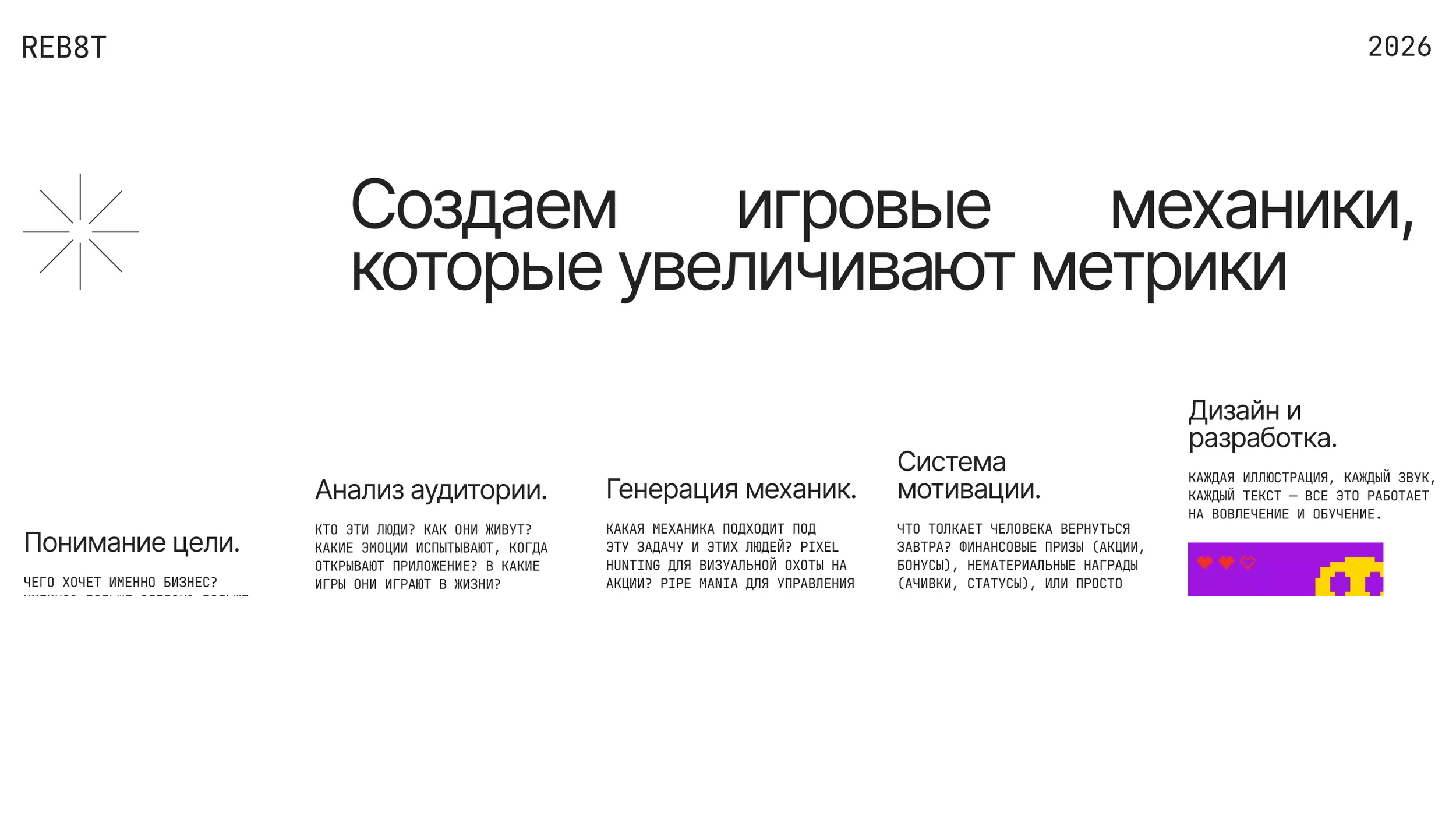 Это и есть наш подход. Избавить от рутины. Дать новые эмоции и знания. Сблизить бизнес и людей. Сформировать привычки. REB8T – перезагружаем привычки. Влюбляем в бренды. Создаём игры.