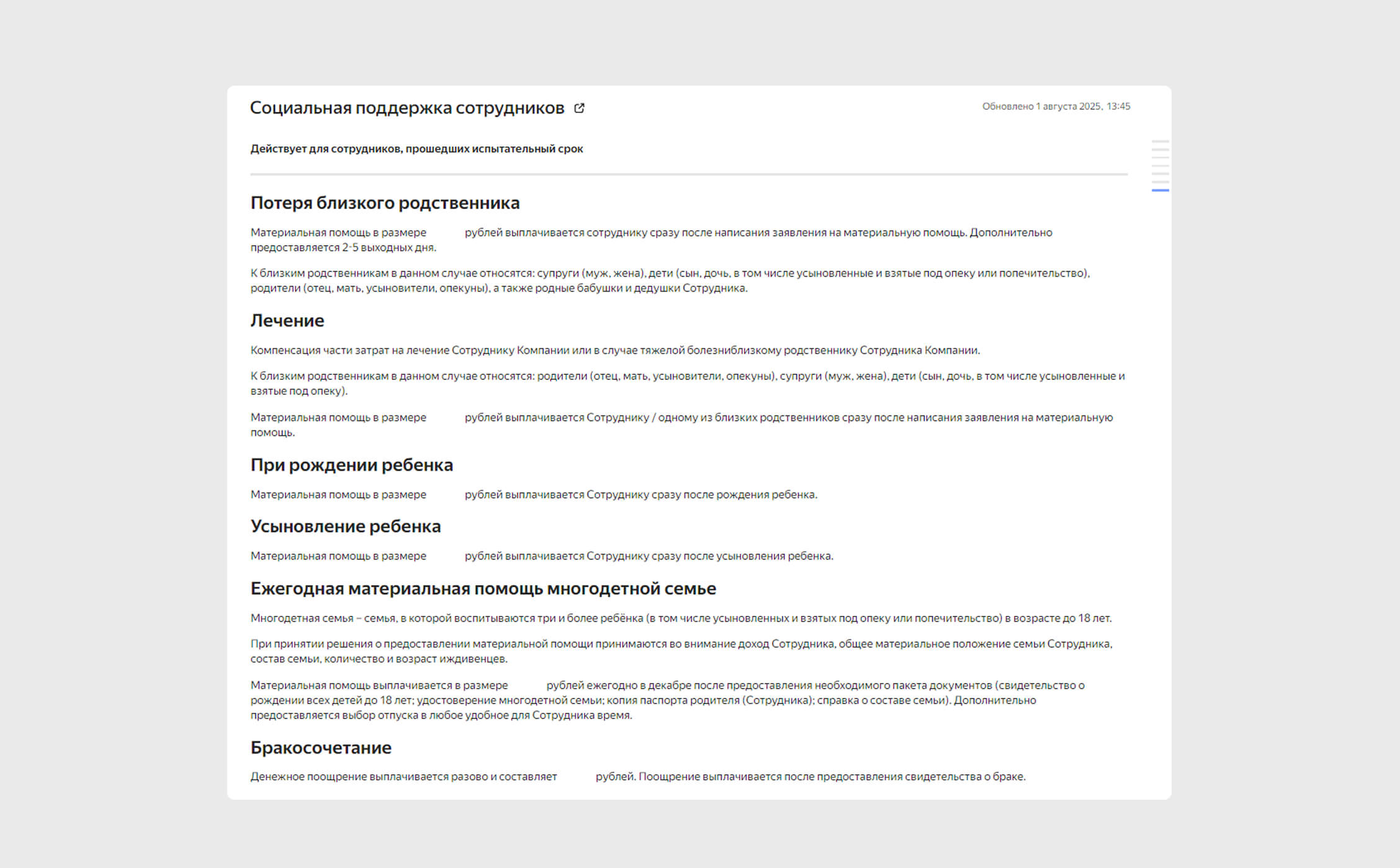Помимо обучения, мотиваций и поощрений у нас предусмотрена социальная помощь сотрудников в различных жизненных обстоятельствах.