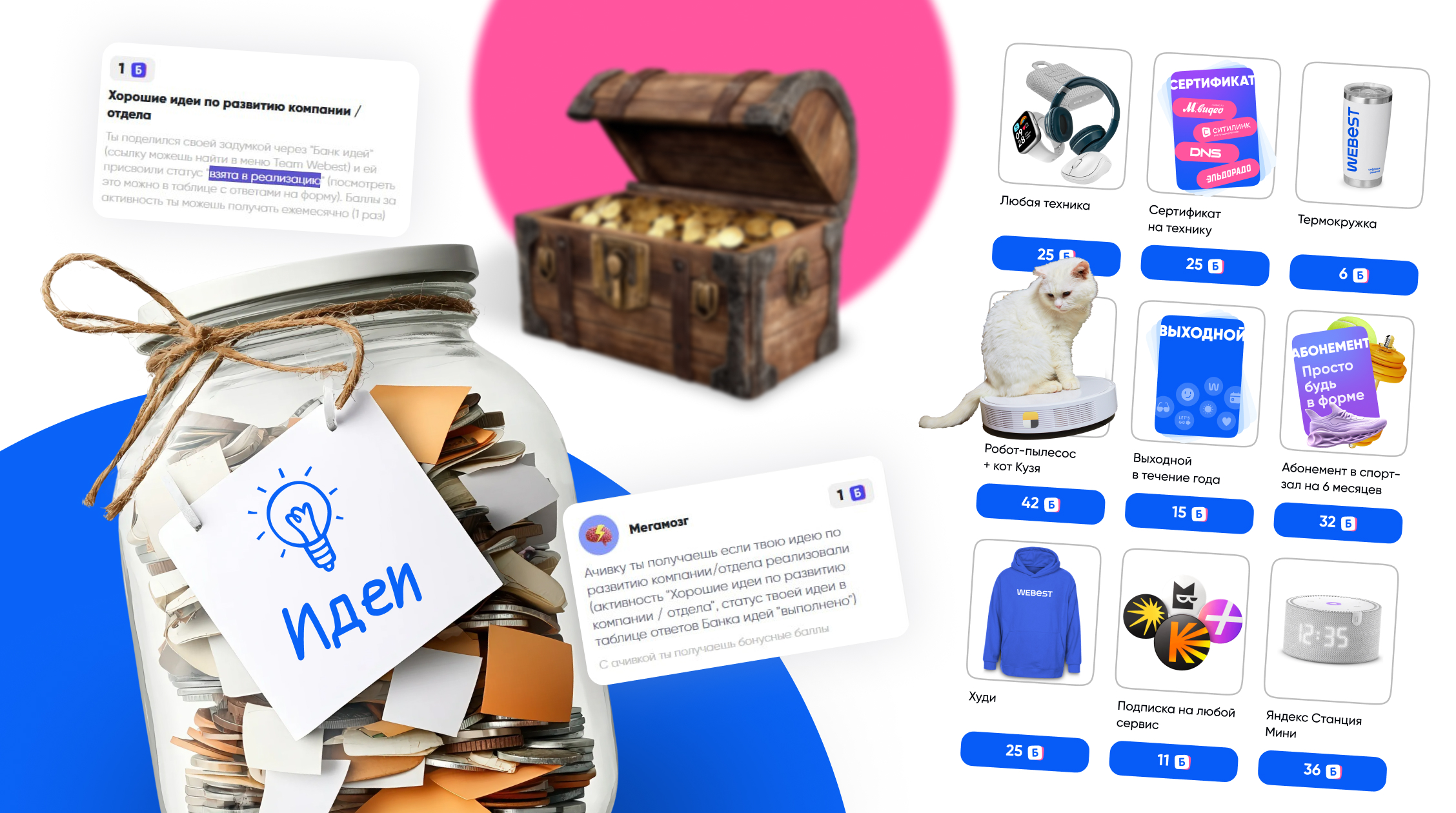 3. Банк идей – поощрения за реализованные идеи по развитию компании. Если сотрудник знает, как автоматизировать или улучшить процессы, то он может зафиксировать мысль в банке идей. В случае, если идею внедрили в работу, сотрудник поощряется за счет геймификации.
