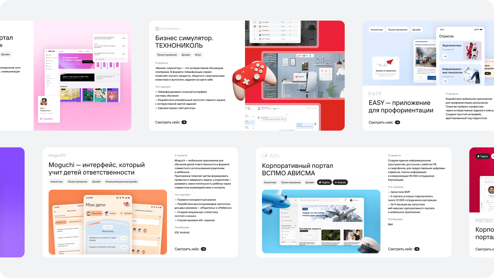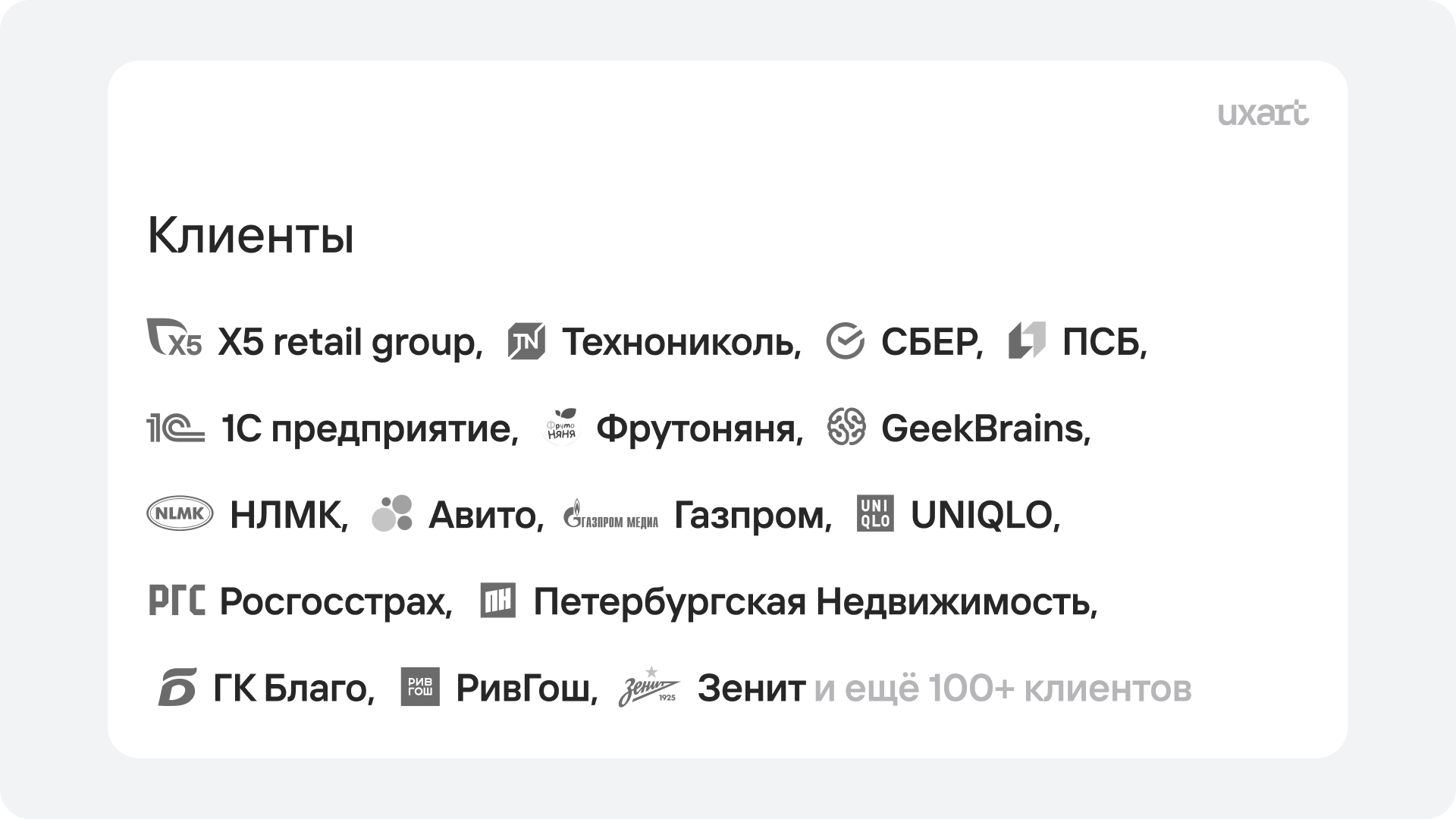 — Наши клиенты — демонстрирует опыт работы с разными компаниями; вызывает ощущение надежности и понимание, что студия умеет работать с проектами разного масштаба.