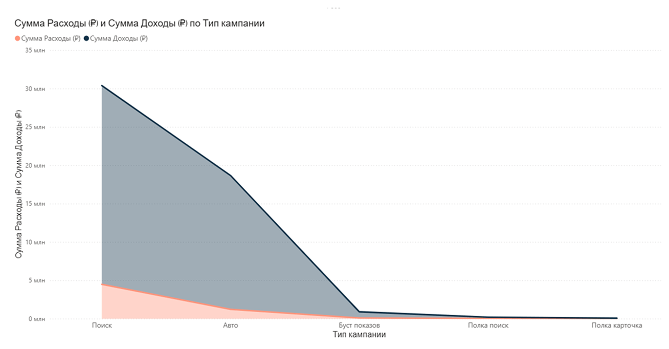 Лучше всего себя показала кампания типа «Поиск» на площадке Ozon. При высоких расходах — 4.48 млн рублей, бренд получил 25.9 млн рублей дохода и продал 65 923 единицы товара. ROI — 5.78. Кампания «выстрелила».