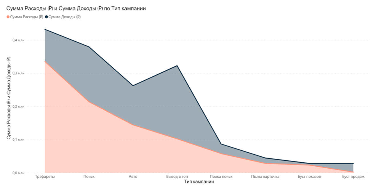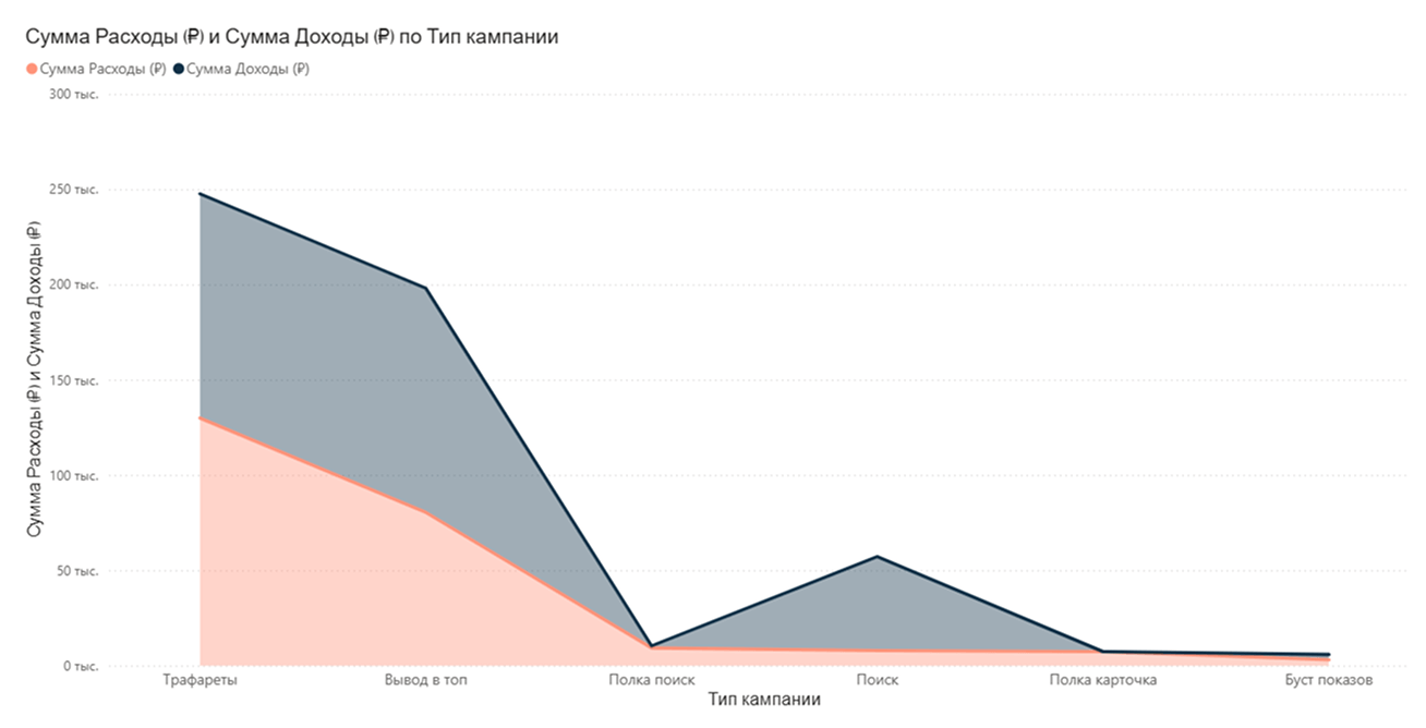 На OZON «Трафареты» при 335 тыс. рублей расходов принесли 97 тыс. дохода. Ушли в минус. «Вывод в топ» показал среднюю эффективность (ROI 2.15). А вот «Поиск» удивил — при скромных 59 тыс. расходов дал 408 продаж.
