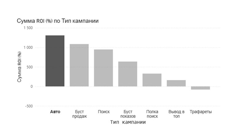 Второе место занимает автостратегия на площадке Wildberries. Автоматическая реклама принесла 53 417 продаж при ROI почти 13x. Рентабельность выше ожидаемой. Автокампания работает даже без сложной настройки.