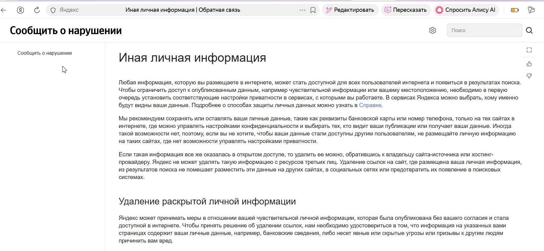 Рекомендуем удалять незаконно опубликованные данные с сайтов и площадок, даже если их не удалось скрыть на первом этапе. Также у Яндекса есть специальная форма для жалоб на личный контент в поиске, опубликованный без согласия. После обращения того, чьи фото были опубликованы, ссылки обычно убирают из выдачи.