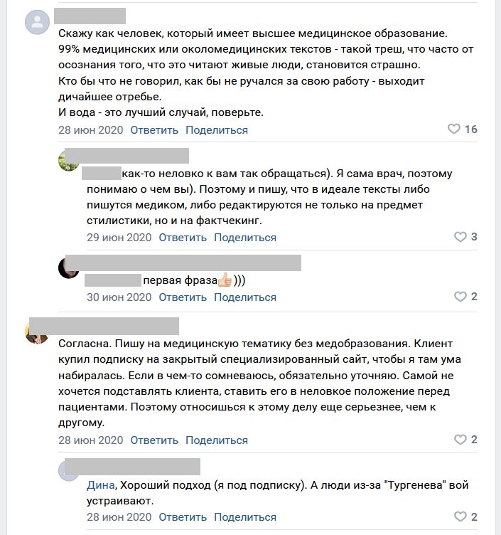 В одном из постов подписчики обсуждали, обязательно ли копирайтеру иметь медицинское образование и опыт работы, чтобы писать статьи про болезни и лечение. Спор был жарким — на десятки комментариев, иногда даже слишком эмоциональных.