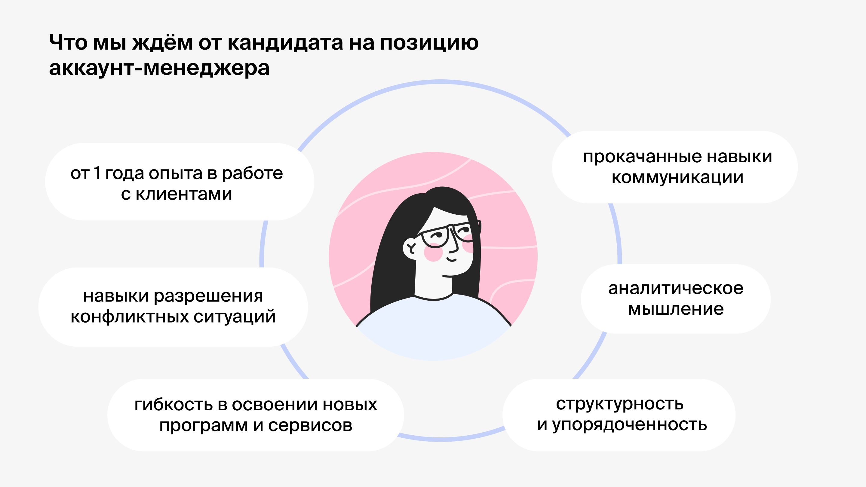 Мы выделили качества и навыки, которые нужны для успешной работы в аккаунтинге. Наш кандидат — человек с аналитическим складом ума и прокачанными софт-скилами. Легко находит общий язык с людьми, умеет решать конфликтные ситуации, может быстро обработать и структурировать большой объём информации.