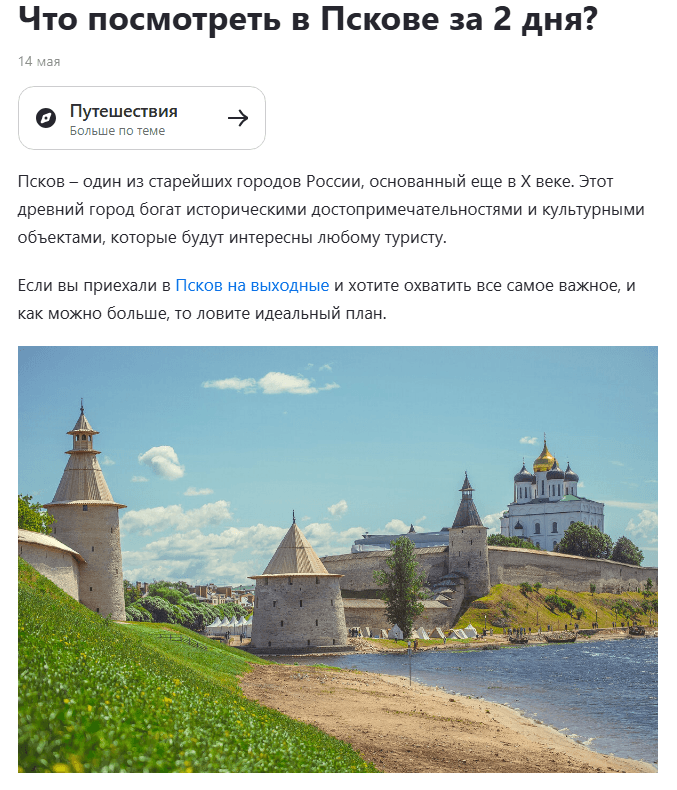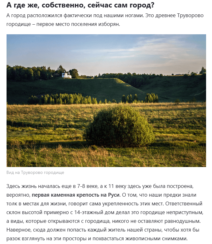 Например, в тексте про конкретный туристический маршрут будет здорово посмотреть на фотографии местности, достопримечательностей и каких-то дополнительных деталей, которые позволят читателю проникнуться атмосферой места и захотеть туда съездить.