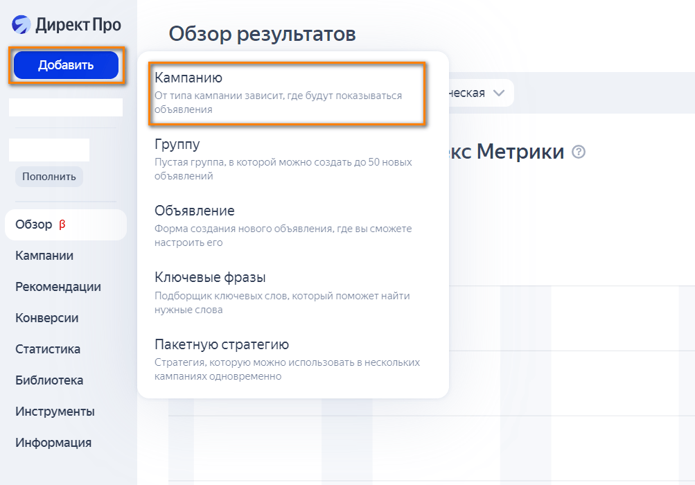 Перейдите в интерфейс Яндекс Директ. Нажмите на кнопку “Добавить” -> “Компанию”.