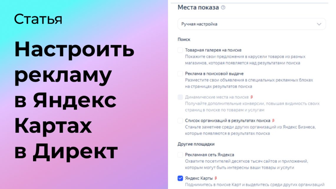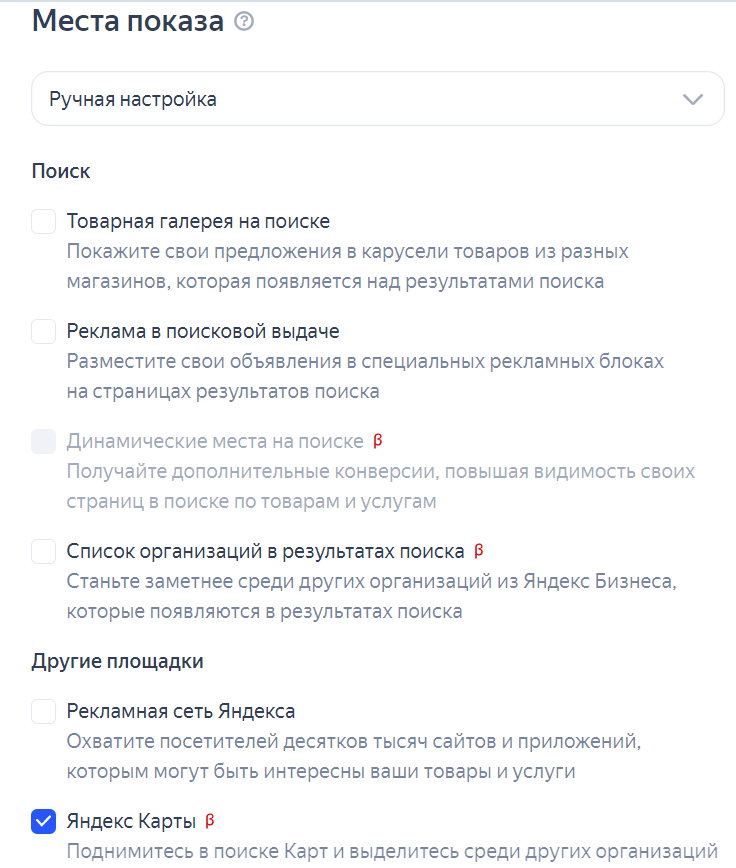 В блоке “Места показа” выберите “Яндекс Карты”.