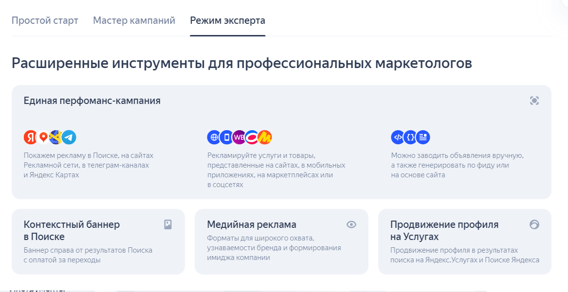 В режиме эксперта выберите “Единую перформанс-кампанию”.