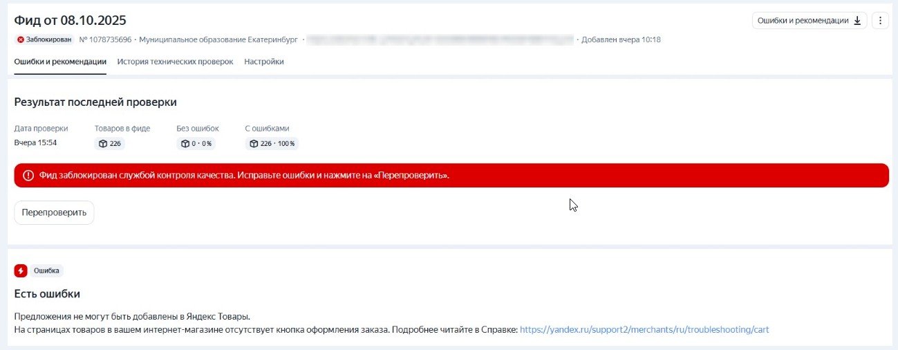 После проверки фида сервисом Яндекс Товары его статус может измениться, если в данных будут найдены ошибки. Проверить результаты можно на странице Товары, вкладка “Фиды” — откройте нужный фид и перейдите во вкладку Ошибки и рекомендации. Внесите необходимые исправления: в течение пяти рабочих дней Яндекс Товары повторно проверят файл и обновят статус фида.