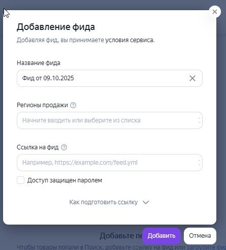 • Ссылка на фид: Вставьте URL-адрес вашего файла (тот, который вы получили при автоматическом формировании, например, https://ваш_сайт.com/feed.yml).