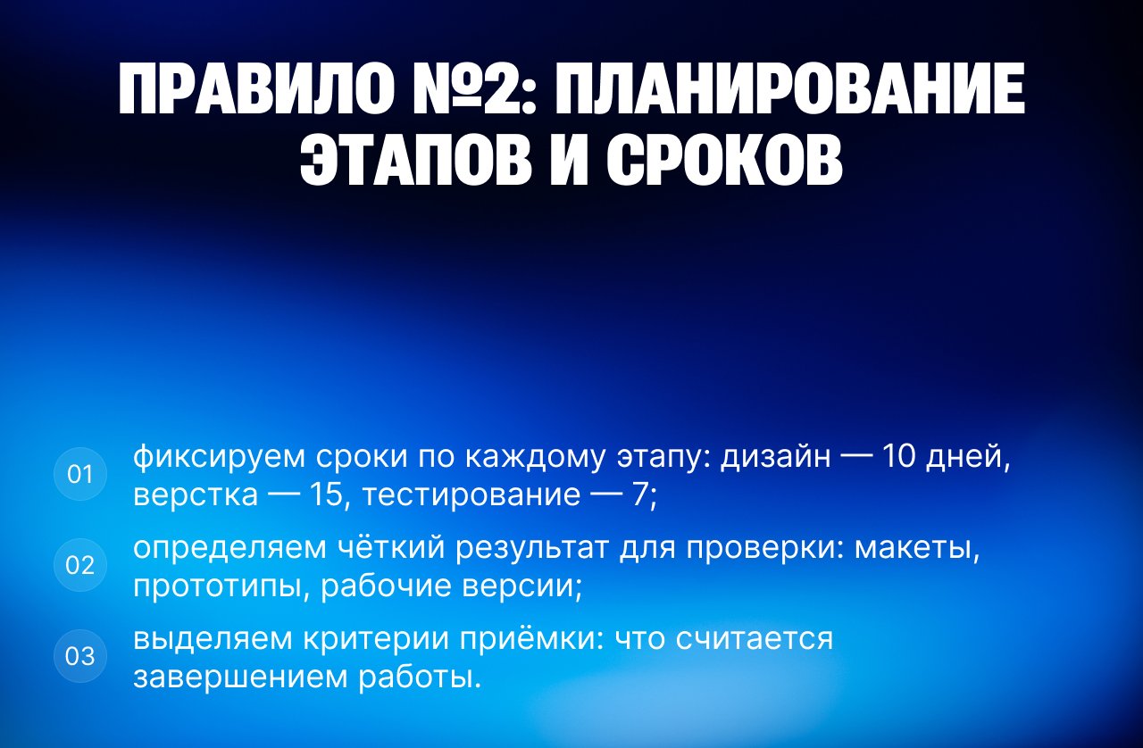 Даже при идеальном ходе проекта важно закладывать небольшой запас времени на доработки. Это позволяет сохранять спокойствие и управляемость процесса.