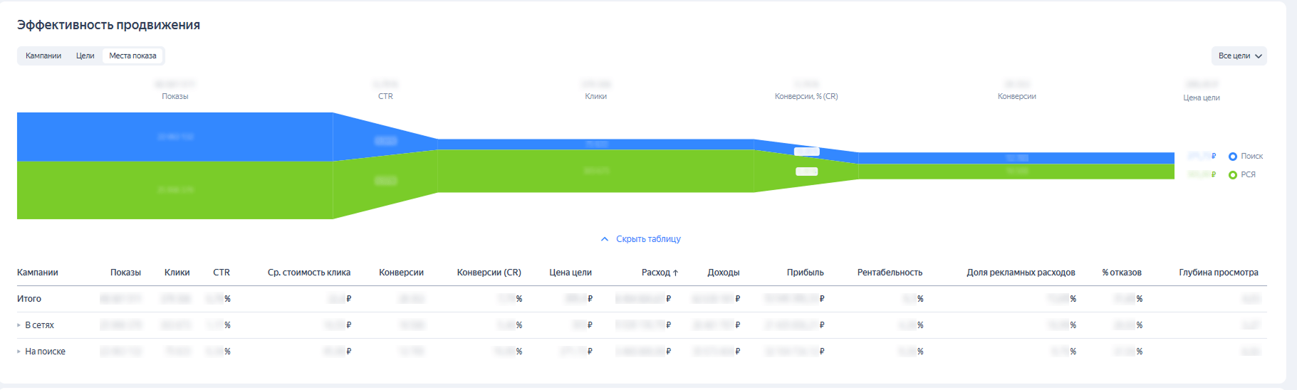 Такие визуализации позволяют оценить, как работают кампании на разных этапах — от показов до прибыли. Видны ключевые показатели по кликам, конверсиям, расходам, доходам и рентабельности.