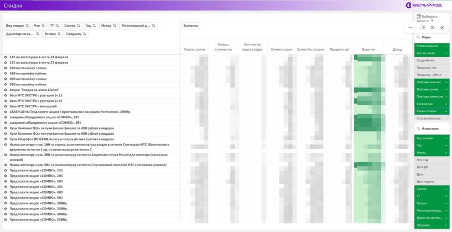У компании около 200 видов скидок. Специальный дашборд позволяет увидеть финансовый результат и детальный анализ по каждому виду скидки.