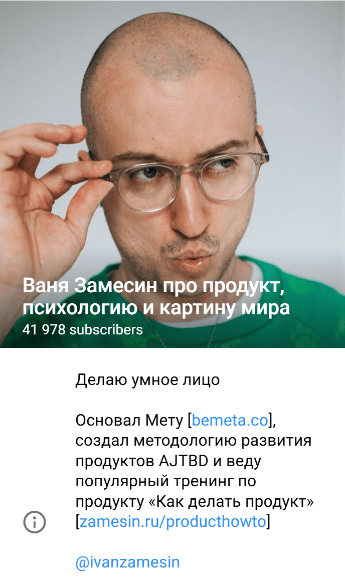 Тут все вроде бы очевидно, но именно поэтому аватар часто остается без должного внимания. Телеграм обрезает все аватарки по кругу, поэтому проверьте, что все важное осталось в кадре. Хорошая аватарка выглядит как логотип: легко запоминается, четкая, читабельная даже на миниатюрном экране смартфона.