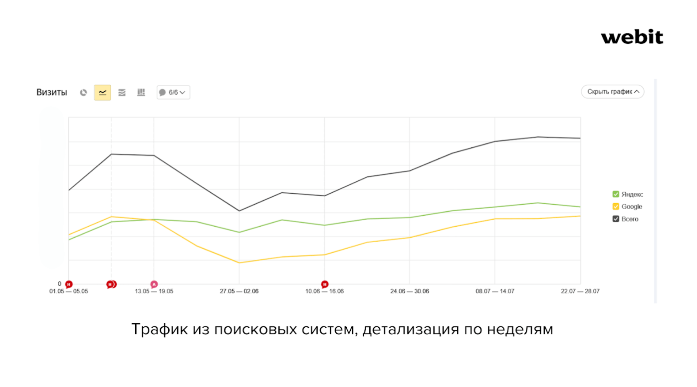 К концу июня проект подхватил SEO-специалист и прекратил просадку. Сайт вернулся к показателям до переезда. С июля начинается рост.