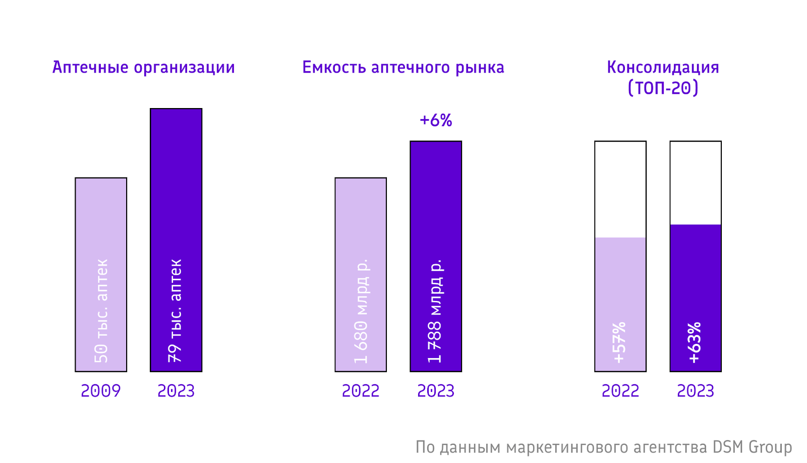 Так как статья про бизнес-аналитику, а значит, про цифры, то начну с них. По данным маркетингового агентства DSM Group, которое специализируется именно на исследованиях фармацевтического рынка, с 2009 года в России растет количество аптек. Например, 15 лет назад насчитывалось 50 тысяч аптечных точек, а в конце 2023-го почти 80 тысяч.